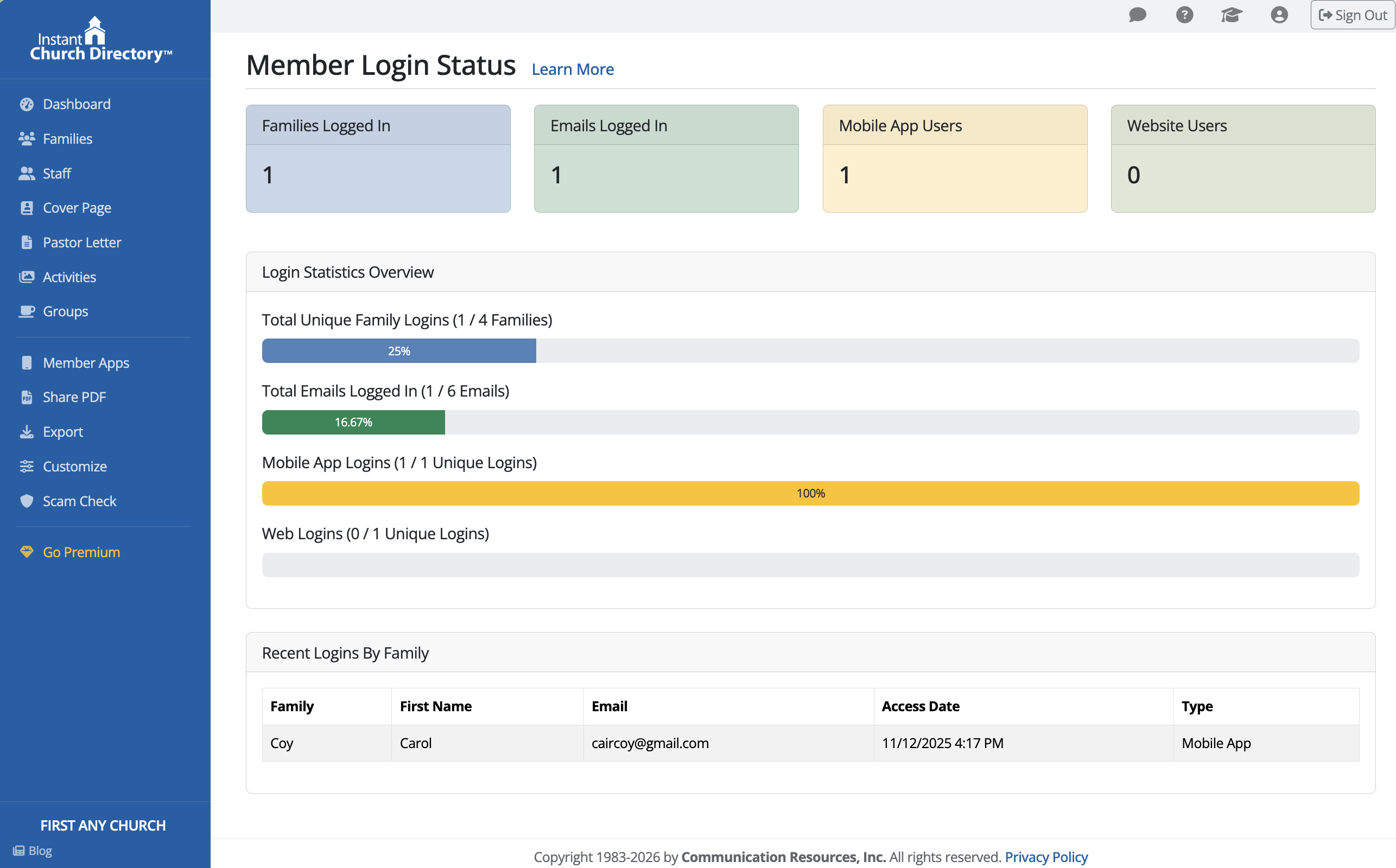 The Member Login Status report offers a clear picture of how your members are accessing Instant Church Directory. It breaks down usage by families, individual emails, and platform (mobile app or website), helping you monitor engagement and adoption trends.