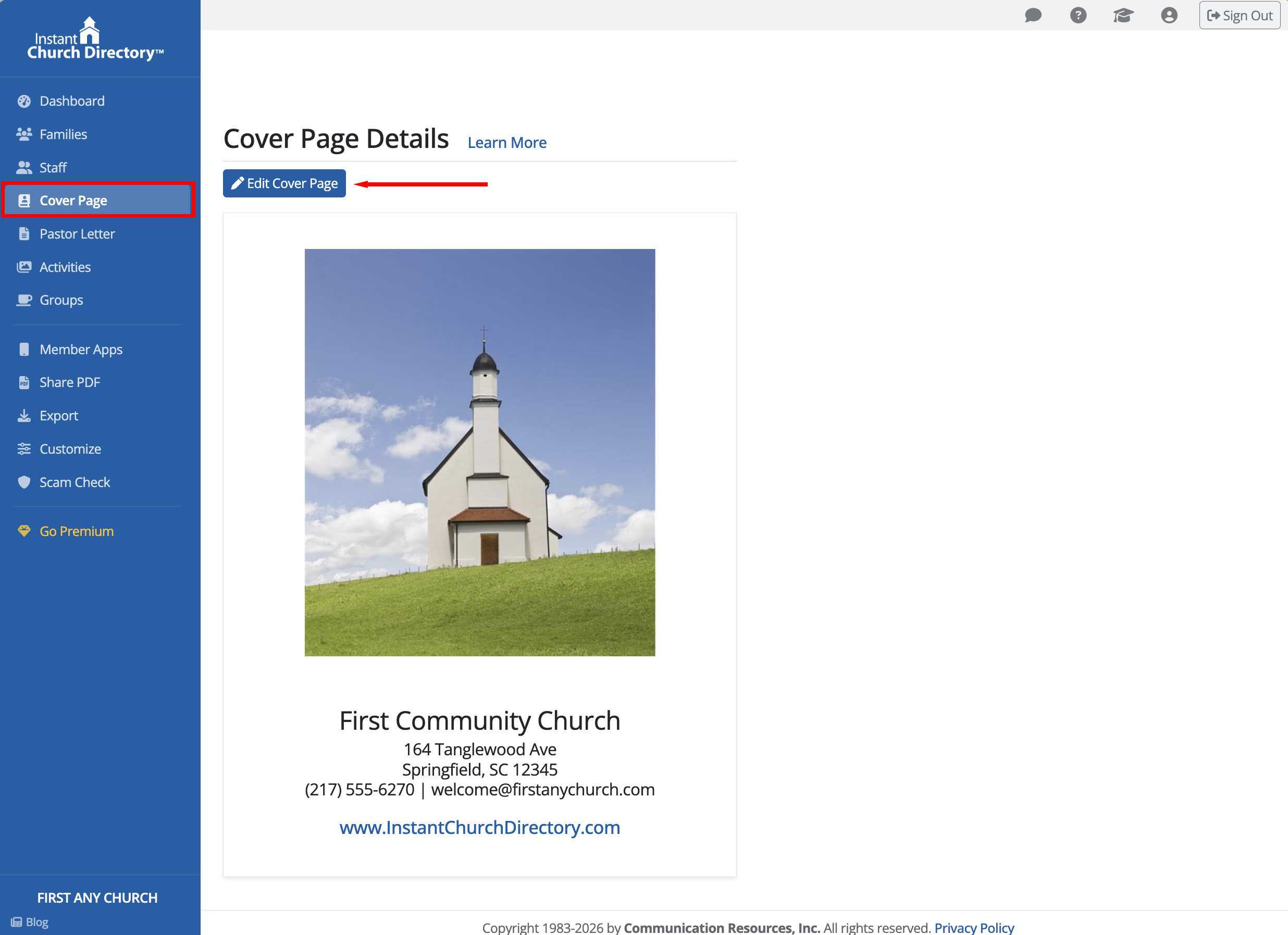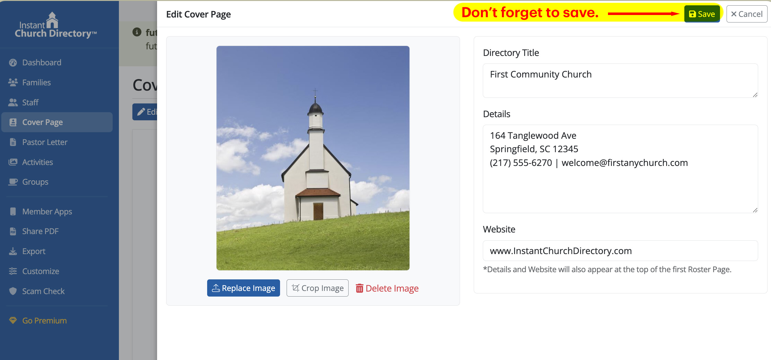 Under Cover Page, you can add your own cover image, title, and additional details about your church. Typically, this includes your church’s address, phone number, website, and hours.